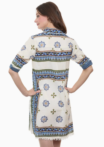 Chatham Dress Blue Green Ivory Engineered Print