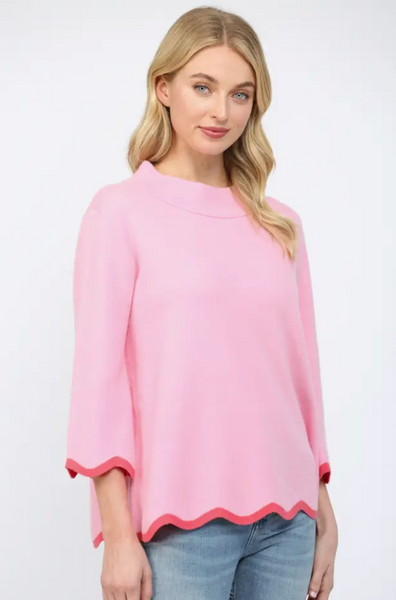 FATE Scallop Edge Detailed Mock Neck Sweater Top - BubbleGum Pink/Coral